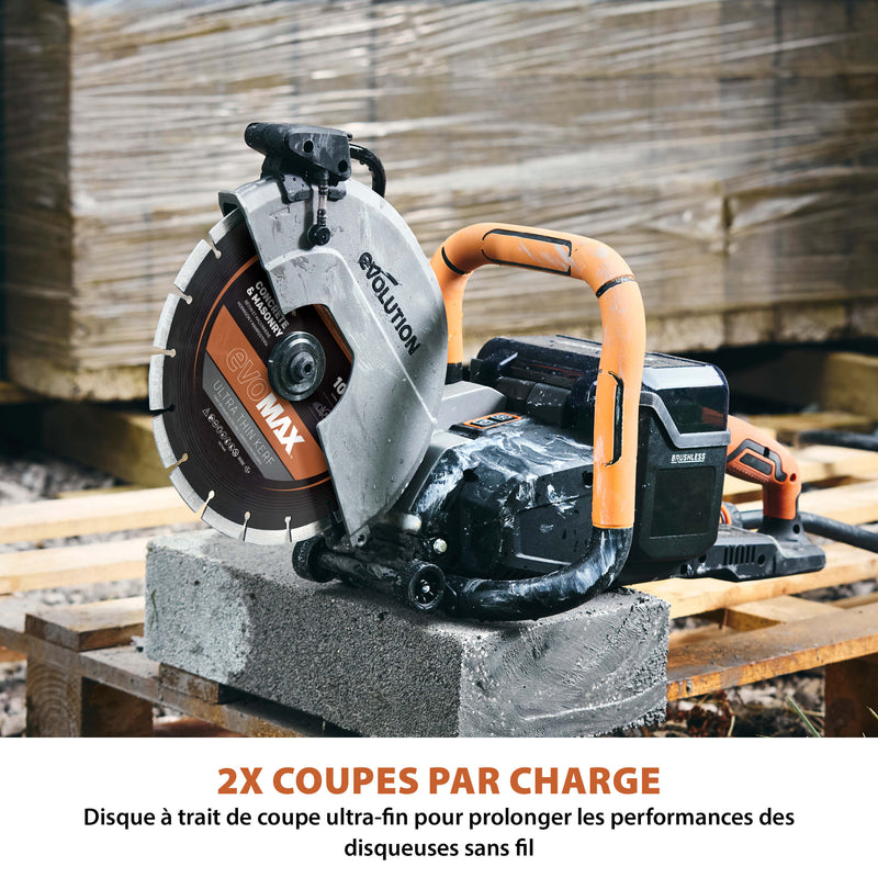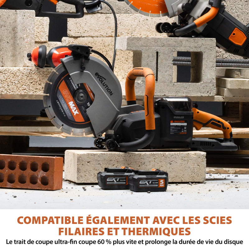 La nouvelle génération de disques diamant premium 260 mm Evolution est arrivée, équipée de la technologie EVOMAX à trait de coupe ultra-fin, spécifique aux outils sans fil.